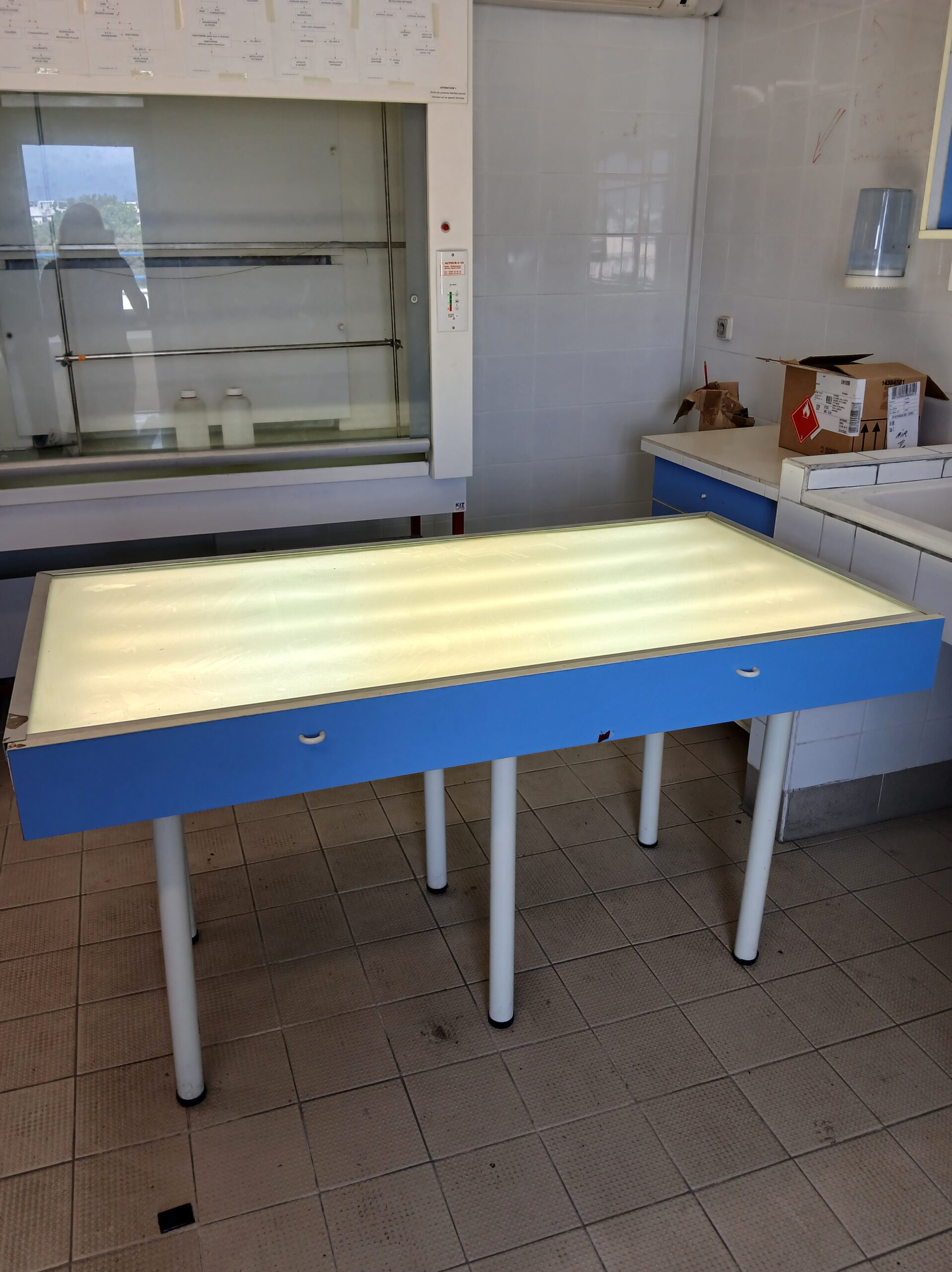 Grande table lumineuse avec néons intégrés sous le plateau.