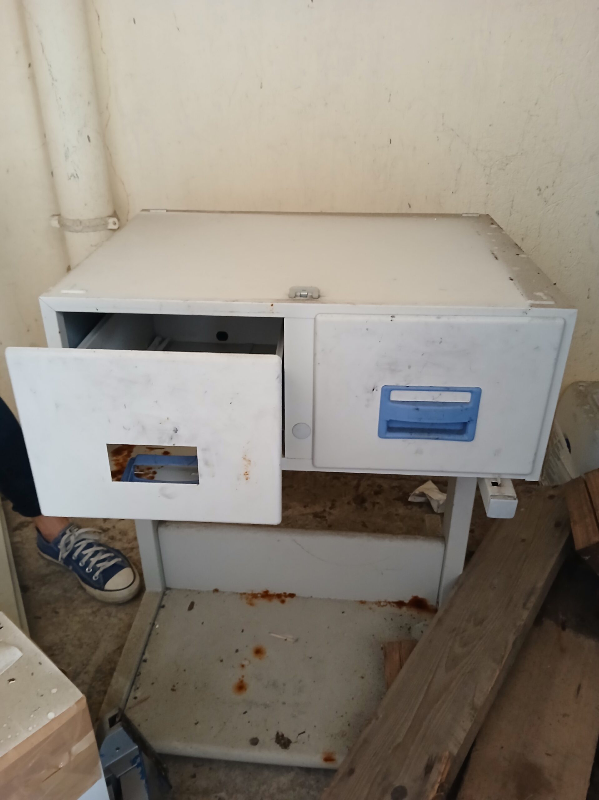 Petit meuble métallique à tiroir, sur pieds. Abimé et sali mais fonctionnel.