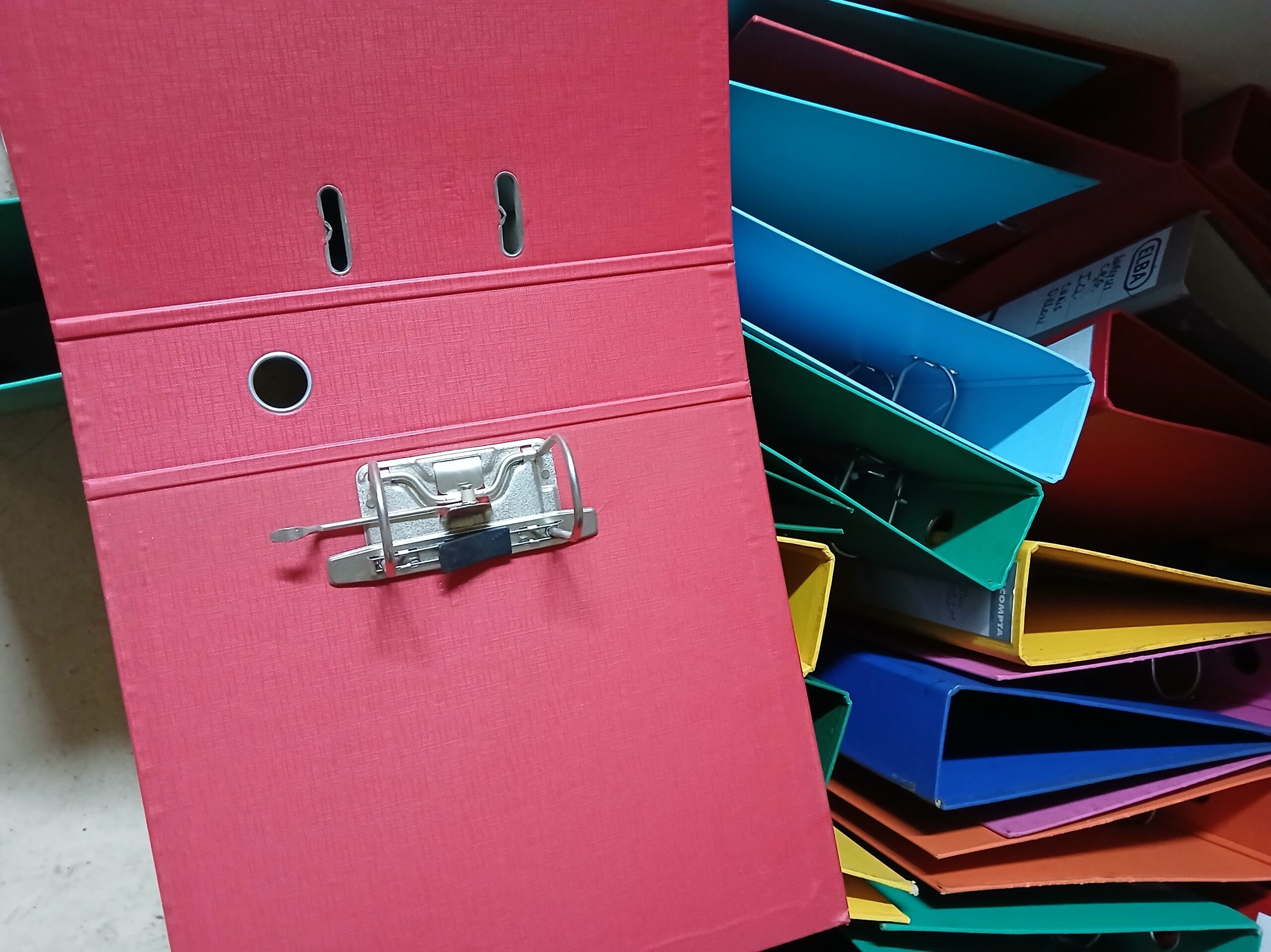 Classeurs de rangement colorés - certains ont des écritures sur la couverture intérieure mais généralement…